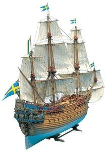 three masted royal ship launched in 1627. Length 70.0 Meters, breadth 11.5M, draught 4.8M displacement 1400 tons, sail area 1150M squared, witha crew of 133 sailors and 300 soldiers. On its maiden voyage in 1628, the Wasa sank in the Stockholm Harbour. Using a primitive diving bell 53 of the ships 64 cannons were salvaged in 1664. The ship itself was lifted from the sea on the 24th of April, 1961 and the Wasa museum was opened the following year. This limited kit includes the building slip FREE, kit also includes laser cut wooden hull and wooden strips, fittings set, sails, rigging thread, plan and manual.##))